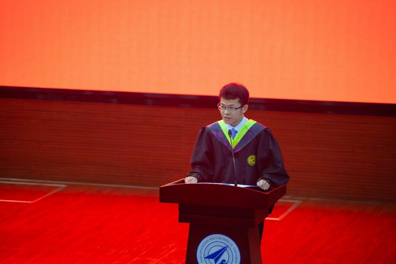 毕业生代表吴君豪同学发言,他将自己的本科生活比作一碗biangbiang面,饱含对母校的留念。在西工大他收获了知识、友情与成长,毕业之际,他心怀敬仰、心怀感恩、心怀梦想,将传承发扬校风校训,奔赴逐梦征途,努力成为祖国航天事业的总师型人才。