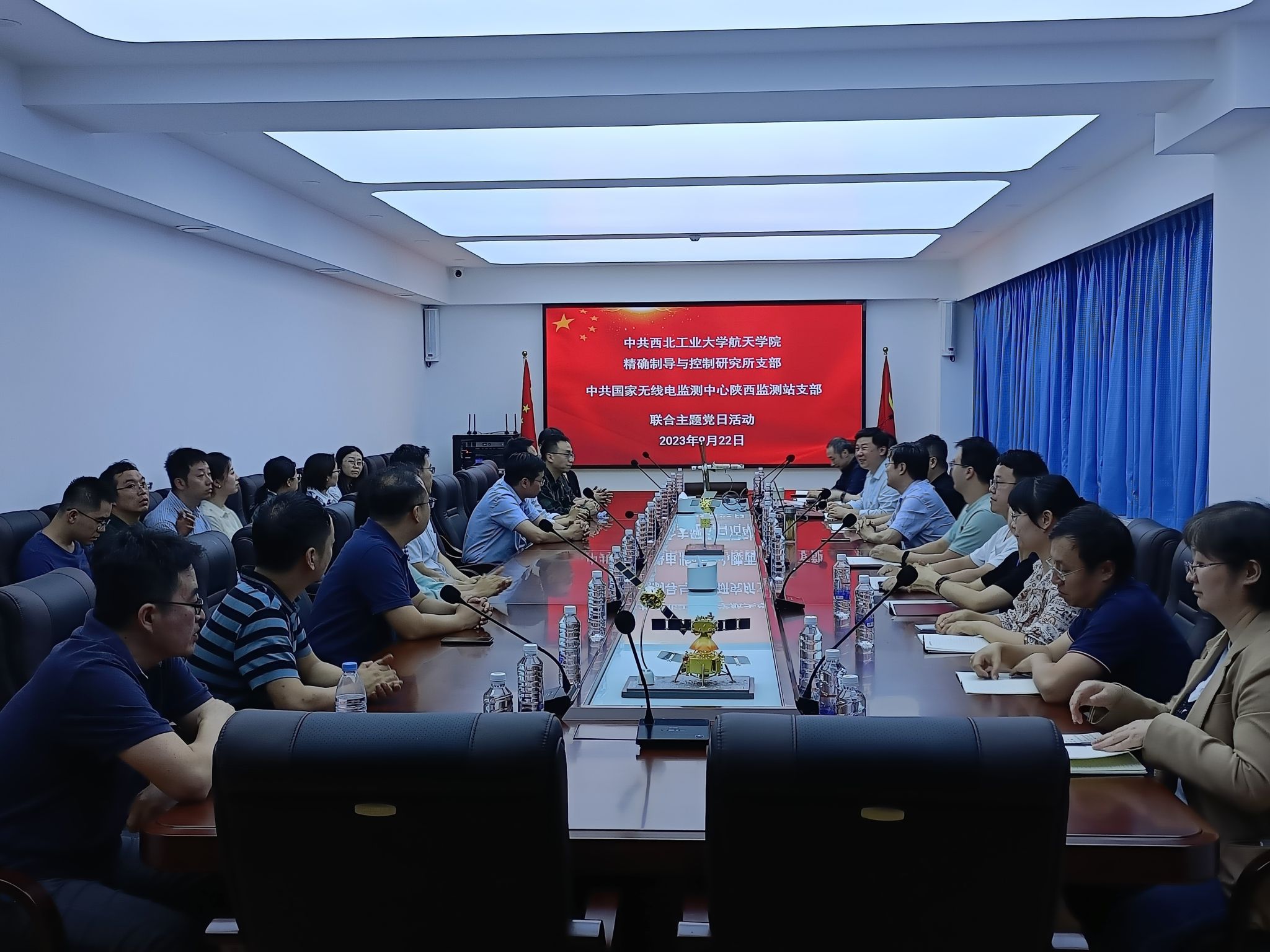 9月22日下午,中共澳门网投十大信誉平台精确制导与控制研究所支部和中共国家无线电监测中心陕西监测站支部在澳门网投十大信誉平台6号楼开展联合主题党日活动。国家无线电监测中心陕西监测站站长赵延安和16位党员职工参观了微小卫星技术及应用国家地方联合工程实验室并进行了座谈交流会。澳门网投十大信誉平台精确制导与控制研究所首席带头人周军教授和精导所教职工党员10人参加交流会议,会议由精导所党支部书记卢晓东主持。