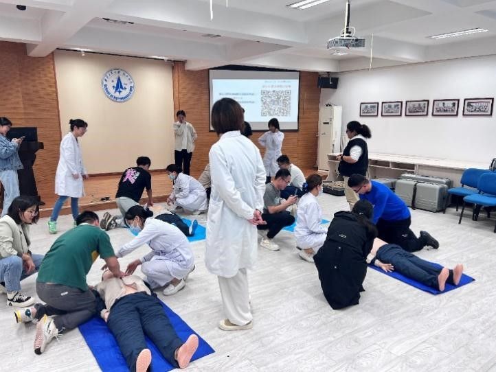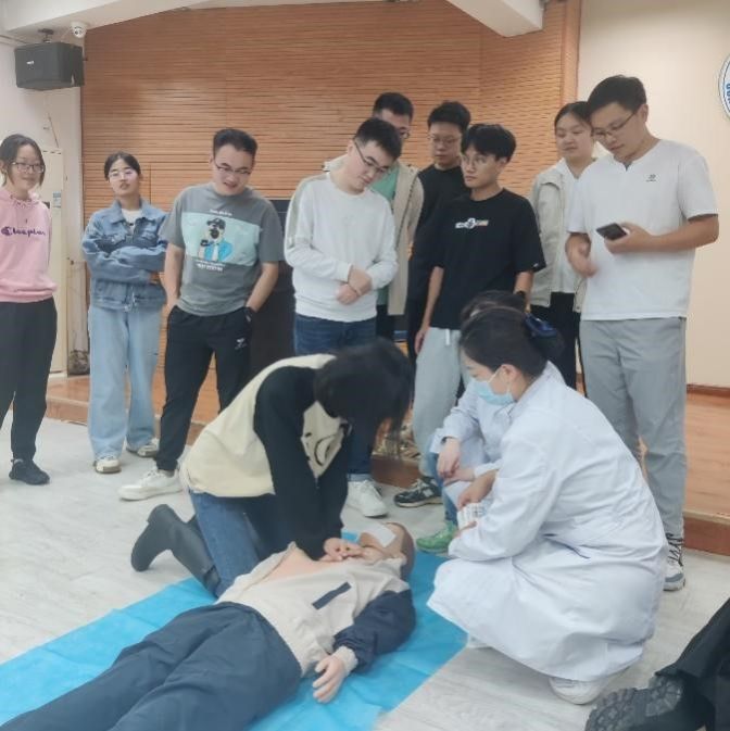 校医院梁乐乐医生详细介绍了心肺复苏、AED使用和海姆立克急救法,并对校医院近年来关于心脏急救应急方面的建设和施救案例进行宣讲。培训现场,医师们和同学们积极互动,为大家展示了急救前准备工作,以及急救中胸外按压、人工呼吸等心肺复苏技术的手法和动作要点。