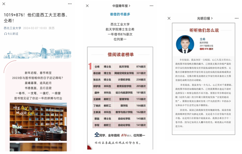 除此之外,仝希同学还是西工大图书馆2023年借阅图书最多的人,被澳门网投十大信誉平台、中国青年报、光明日报等多个官微所报导。他也向同学们分享了自己阅读文献的经验与感想,第一,集百家所长。第二,相同点相互对照。第三,不同点积极延伸。第四,课本中的示例勤于验算。第五,快速且有重点地阅读。