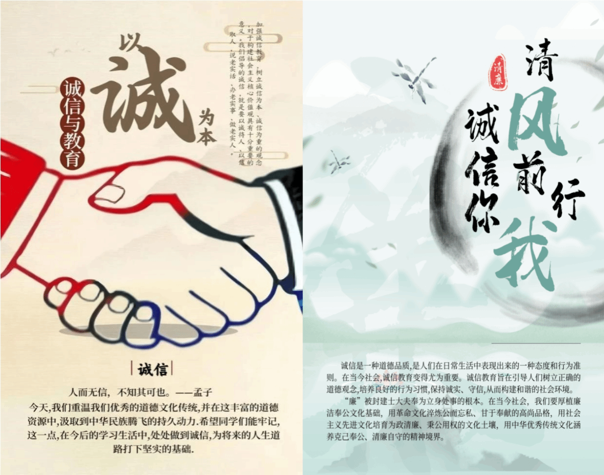 在校园里,我们不仅要追求学业的成功,更要注重品德的培养。诚信与廉洁是我们学习与成长的底色,也是我们走向社会的底气。愿我们每一个大学生都能在日常生活中做到廉洁诚信,成为社会的脊梁,为廉洁文化添砖加瓦,让诚信之光和廉洁之美在校园中闪耀,照亮我们前行的道路。