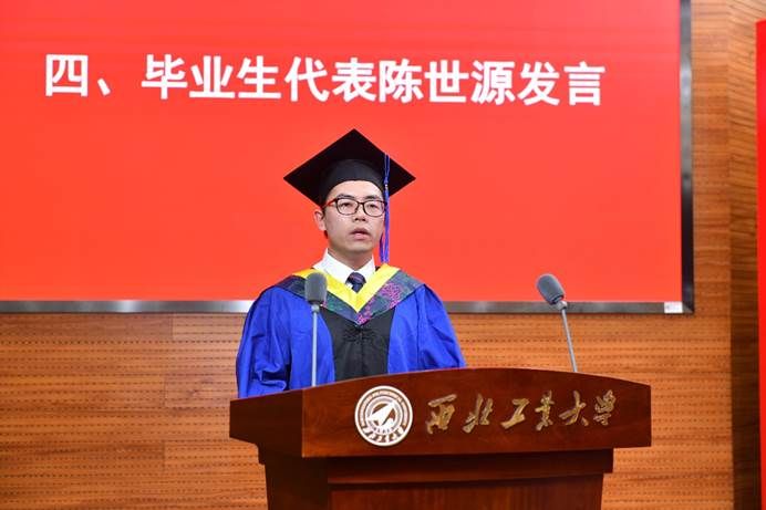 毕业生代表陈世源同学围绕“思想领航,矢志不渝”,“精益求精,做真科研”,“赓续火种,继往开来”三个中心,遥想工大脚踏实地、为国奉献的光辉历史,回忆自己拼搏进取、承前启后的求学岁月。他表示要将“总师育人文化”中蕴含的精神内化于心,外化于行,努力成为具有家国情怀、创新精神和实践能力的优秀人才,并祝福母校在“127”新征程上再谱华章,祝愿所有同学前程似锦!