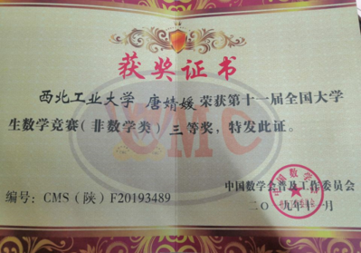 竞赛方面,2019-2020学年共获各类奖项11项,其中国家级2项,省级3项,校级5项。李睿同学代表澳门网投十大信誉平台参加2019中国国际飞行器设计挑战赛,并斩获限时载运空投项目个人一等奖和团队第三名,丁舒昱、梁致华同学参加全国三维数字化数学创新设计大赛,并斩获一等奖。梁俊伍与唐婧媛同学参加第十一届全国大学生数学竞赛并分别或得一等奖和三等奖,梁致华、高伟、欧树彦、李睿、刘海礼、张沥升同学一起进行社会调研,参加了澳门网投十大信誉平台2019年“和理有话说”思政课社会调查大赛,获得一等奖,并接受陕西省电视台采访,班级科研竞赛方面可谓是硕果累累。