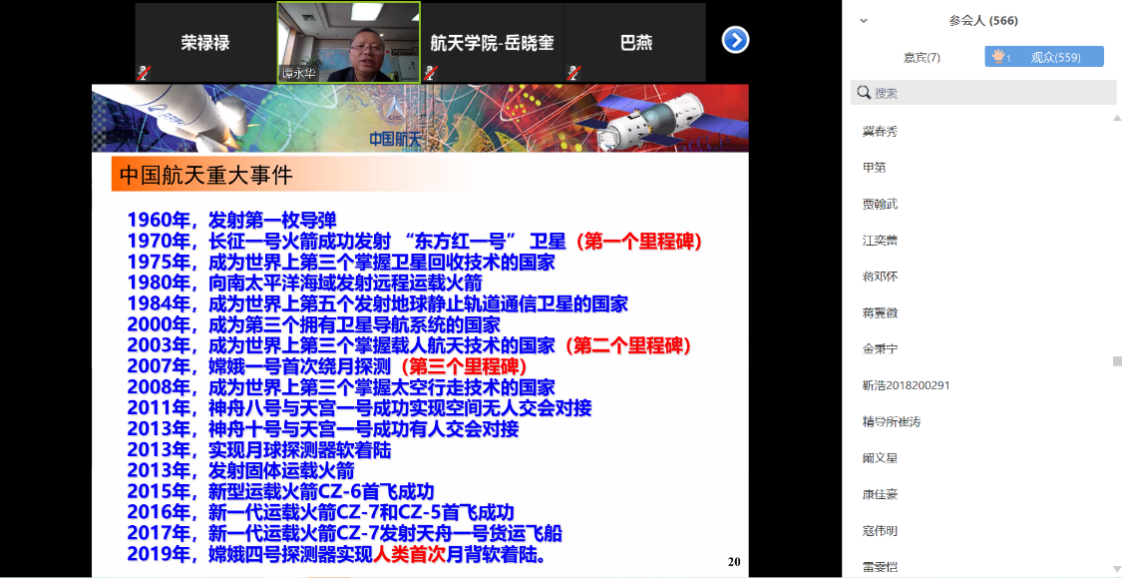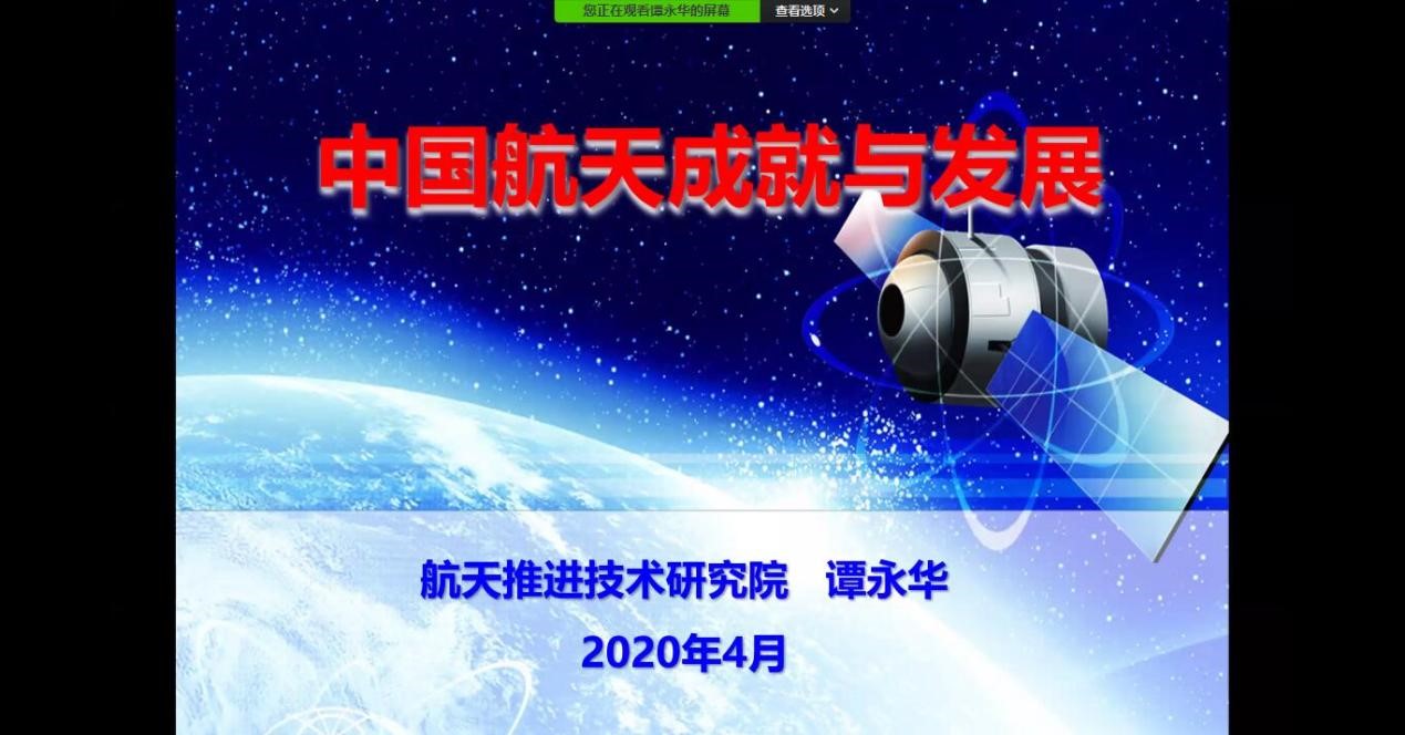 4月22日,在第五个“中国航天日”来临之际,澳门网投十大信誉平台举办翱翔名家讲堂,澳门网投十大信誉平台知名校友、中国航天科技集团第六研究院谭永华研究员作题为《中国航天的成就与发展》,近千名师生齐聚云端聆听了本场报告,报告会由澳门网投十大信誉平台党委副书记(主持工作)岳晓奎主持。