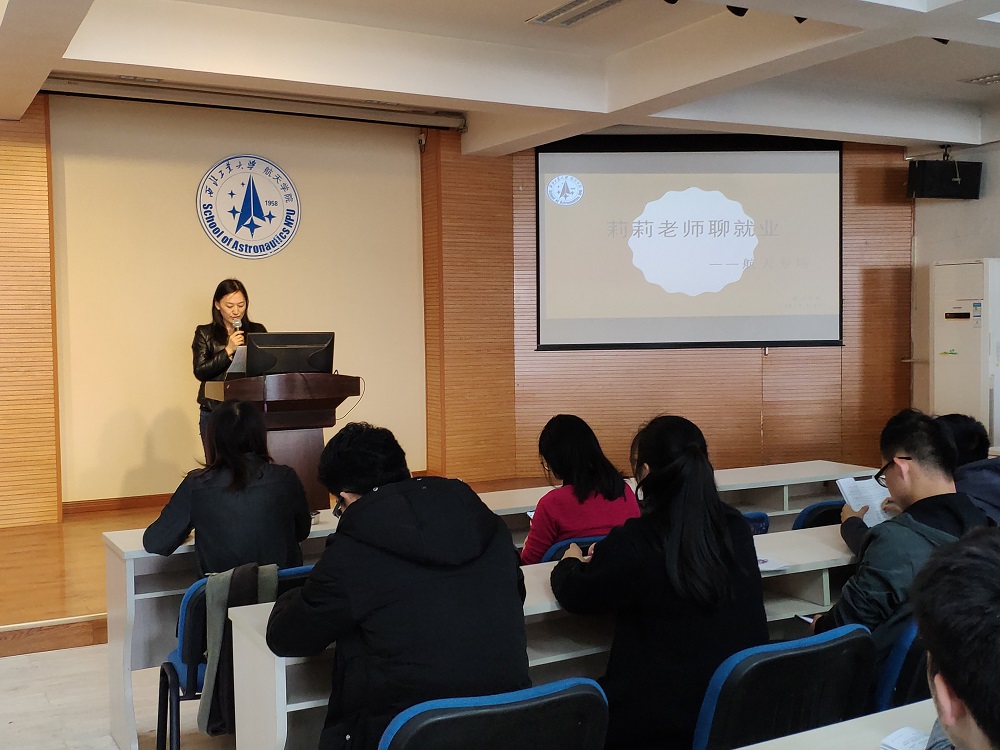 为进一步加强学院就业工作,增强学生的职业规划能力,使学生提前了解就业形势,做好就业准备,2019年3月21日下午,澳门网投十大信誉平台在四号楼六楼多功能厅举办了“莉莉老师聊就业之航天专场”分享会,邀请学校党委学生工作部副部长、学生处副处长王莉和就业创业指导服务中心朱莉老师主讲。澳门网投十大信誉平台研究生辅导员罗淑娟、本科生辅导员杜飞、苟建军,全体2020届研究生,部分本科生参加。分享会由澳门网投十大信誉平台党委副书记常威威主持。
