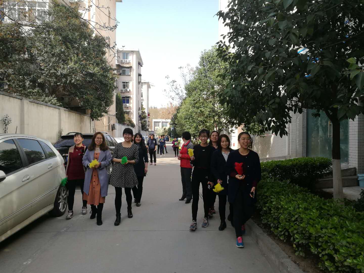 比赛还未开始,已有不少老师提前拿起毽子进行赛前热身。比赛前,队员们围着学院办公楼集体健步走一圈,大家放下手头工作,友好交流,其乐融融。热身健步走结束后,队员们投入了紧张的毽子单踢两分钟计时比赛。老师们一个个精神抖擞,做出了各种各样的动作,有的一直用一只脚踢,有的双脚交换着踢,抛毽、甩手、踢毽,眼睛追着毽子的起落,五彩的毽子被踢得上下翻飞迟迟不愿落地,整个比赛充满了奋力拼搏、激情欢乐的气氛。