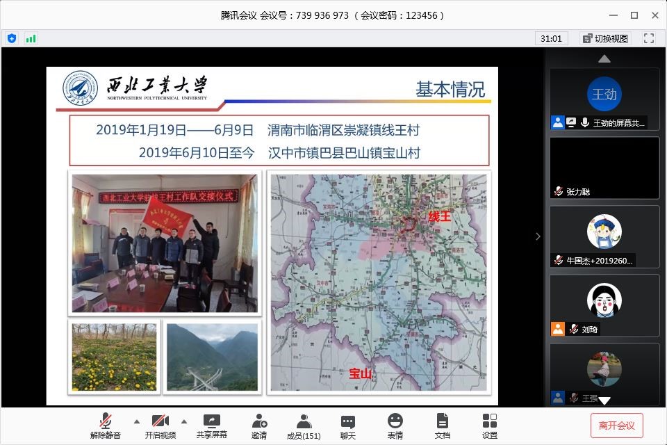 王劲从驻村工作情况、疫情防控措施和青年学子与脱贫三个方面进行了分享与交流。在驻村工作中,王劲因地制宜、因人制宜,不断适应学习,完成了从学校到乡村工作角色的转变。立足于本村实际,制定了“红色教育+国防教育+消费扶贫”的脱贫攻坚发展路线。不仅如此,王劲还有效利用西工大优质科教资源组织开展暑期支教、社会实践等多样化教育帮扶形式,阻断贫困代际传递。在新冠肺炎疫情防控工作中,充分发挥农村基层组织和党员的先锋模范作用,设立检查站严防疫情输入;利用微信、抖音等网络媒介进行防控宣传;落户到人,做好登记等。最后,王劲就“青年学子与扶贫”的话题发表了自己的看法:青年一代是具有创造力和想象力的一代,是打赢脱贫攻坚战的主力军,需要不断地在生产活动和社会实践中励练自己,正所谓“拔节抽穗,培根铸魂正当时”。