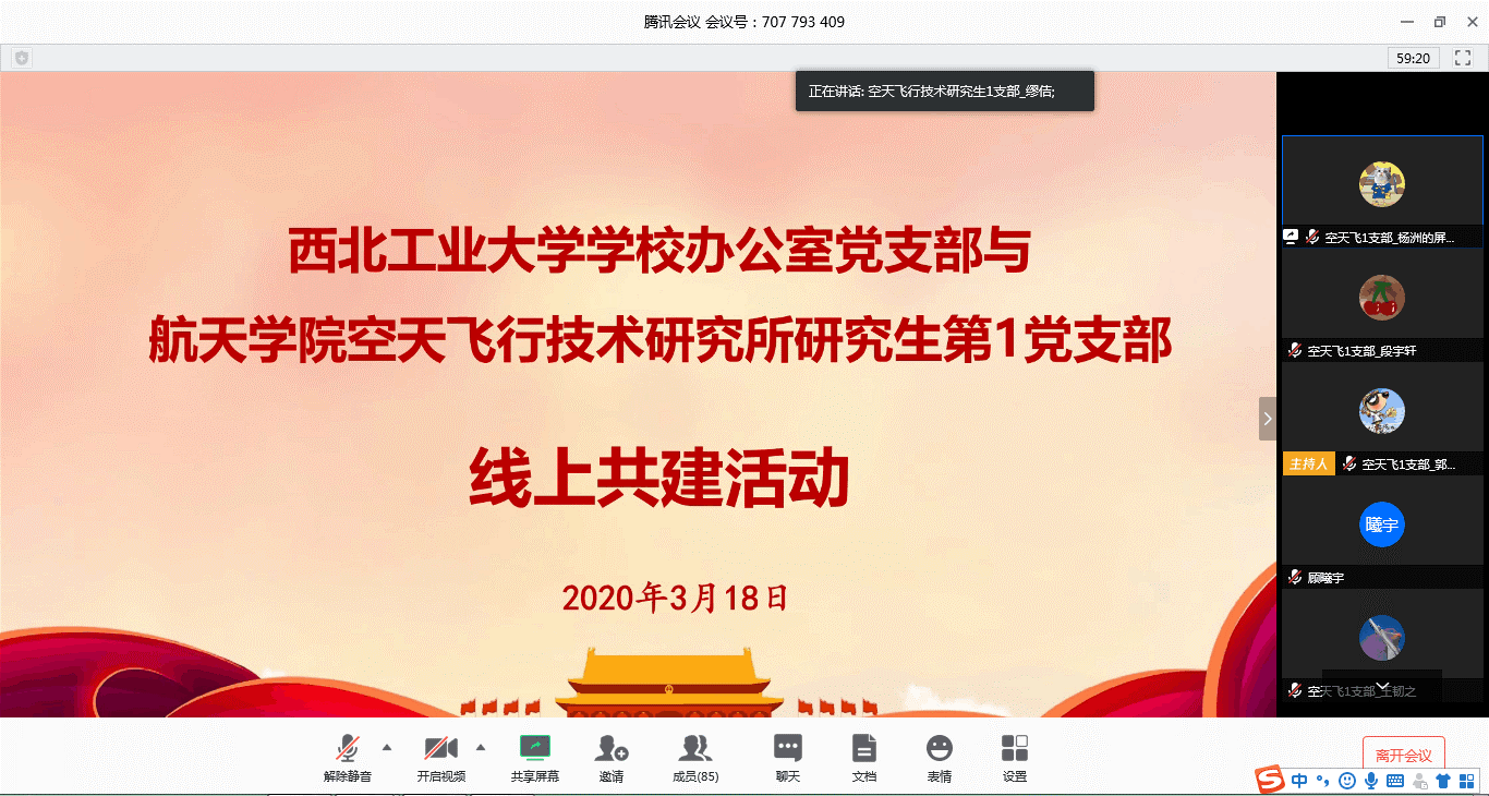 3月18日下午,学校办公室党支部与澳门网投十大信誉平台空天飞行技术研究所研究生第1党支部全体党员齐聚云端,以“我身边的抗疫故事”为主题,开展了一次别开生面的线上支部共建活动。澳门网投十大信誉平台党委副书记王强、学生辅导员、学院全体学生党支部书记及24位班级小导师也参加了本次共建活动。