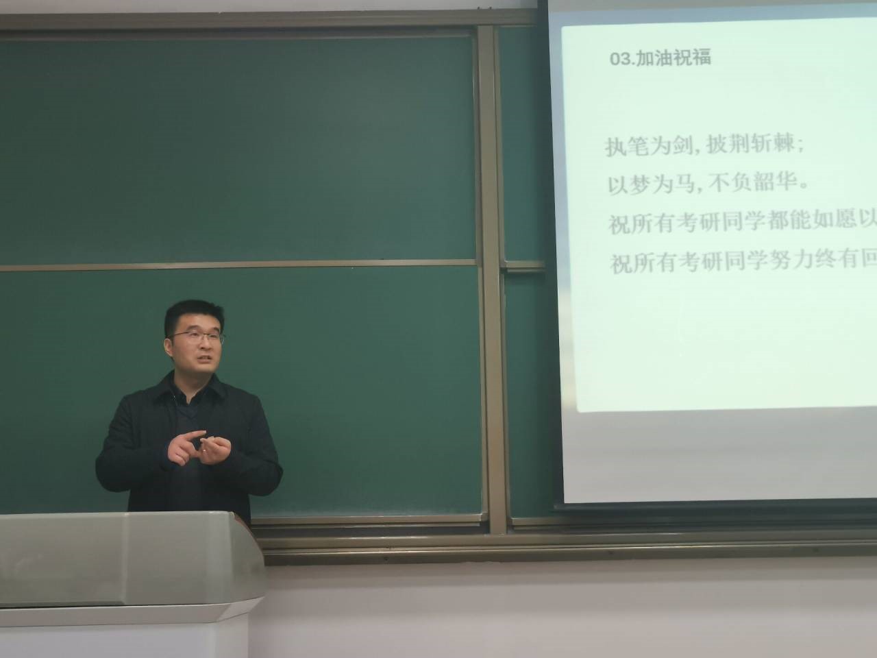 活动伊始,同学们共同观看了《星光不负你》考研励志纪录片。就像视频中说的那样,“熬过最难熬的日子便是满地阳光”,对正在考研冲刺关键阶段的同学来说,视频激励他们在这最后时刻一定要咬牙坚持,既要按部就班地继续努力复习,也要积极向上的面对即将到来的考试。紧接着,同学们全体合唱励志歌曲《我相信》,在释放心中压力的同时,也为同学们注入必胜的信念。“执笔为剑,披荆斩棘;以梦为马,不负韶华”,同学们带着高昂的士气放声歌唱,手中的灯光和心中饱满的热情点亮了整个教室,相信同学们一定会取得成功,努力一定有所回报。