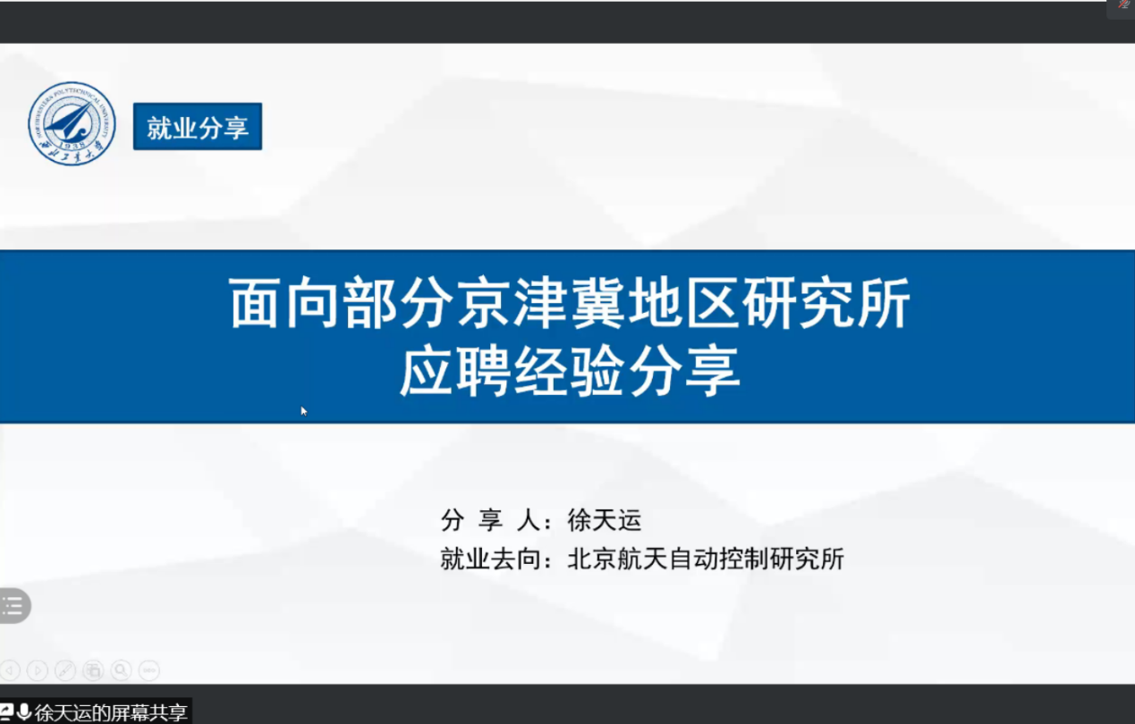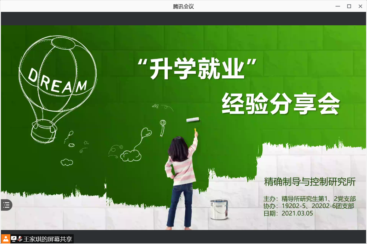 3月5日晚,澳门网投十大信誉平台精确制导与控制研究所在腾讯会议举办以“升学就业”为主题的经验分享会。本次活动由澳门网投十大信誉平台精确制导与控制研究所研究生第一、二党支部主办,19202-5、20202-6团支部协办,精导所学习委员王家琪主持会议,精导所2019级、2020级全体硕士生参加会议。