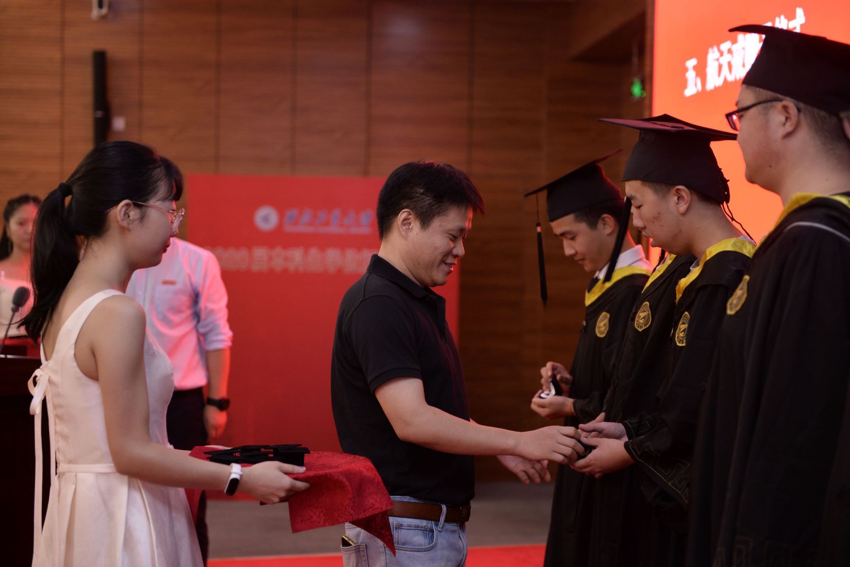 樊会涛院士、岳晓奎为12名优秀毕业生颁发航天戒,希望他们不负韶华,在奋发有为中践行初心使命。