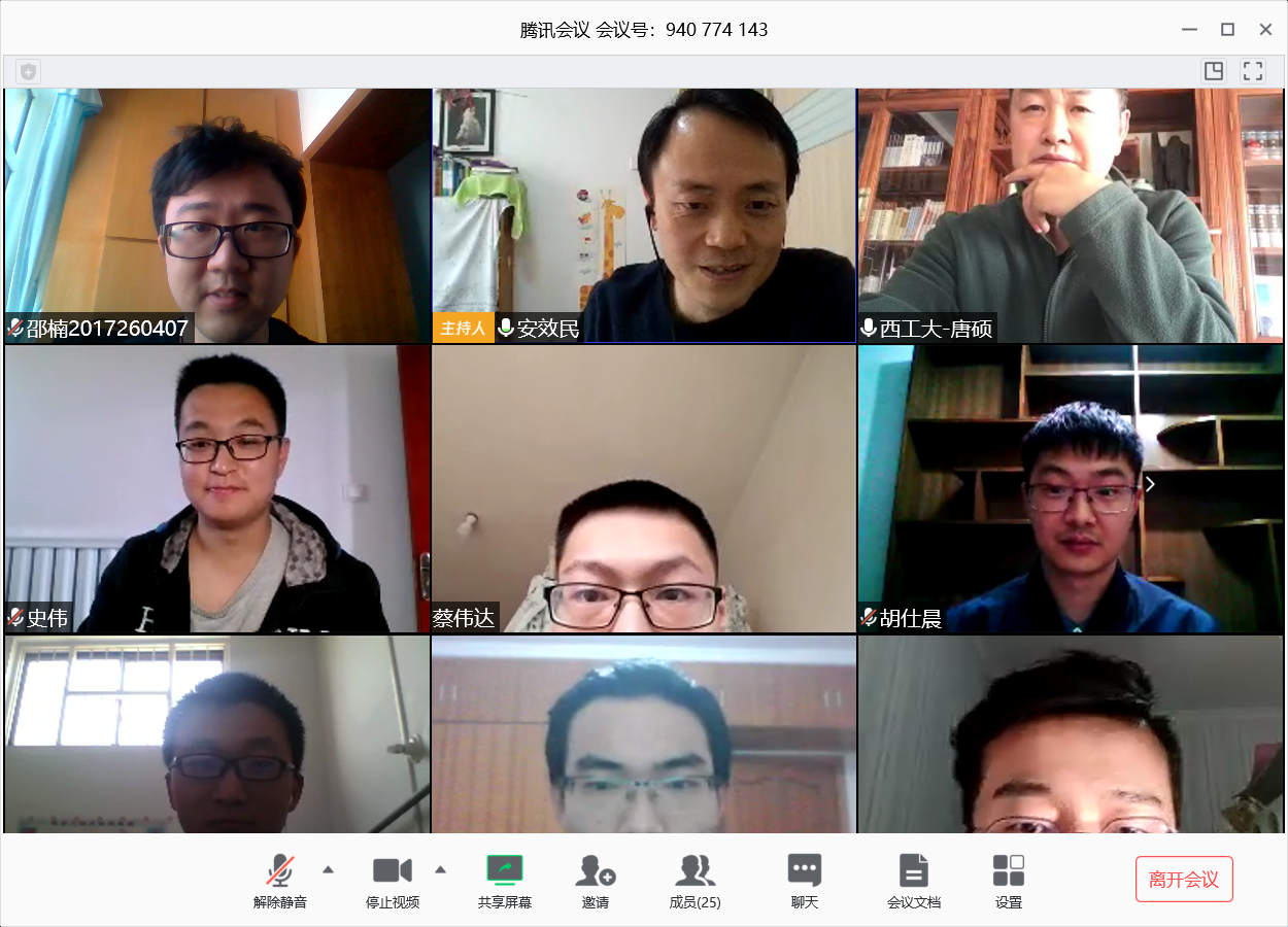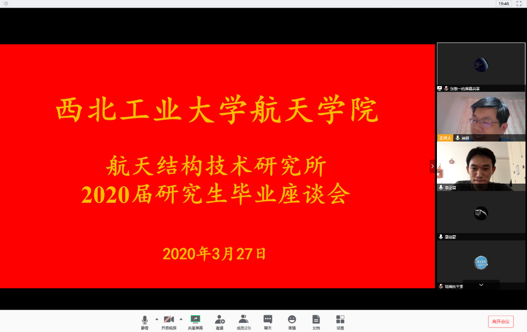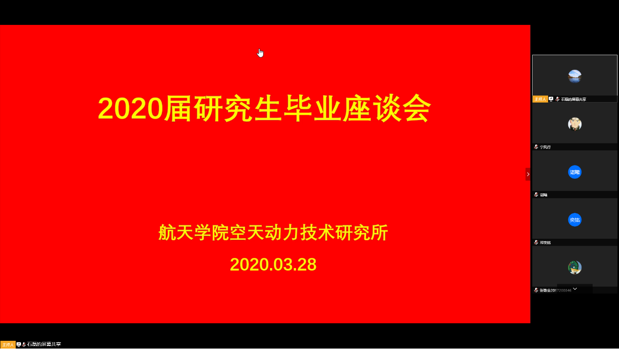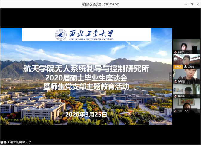 2020年3月25日至4月2日,澳门网投十大信誉平台按照学校要求,以研究所为单位组织召开了“感恩工大情 激扬爱国志”2020届研究生毕业座谈会,学院领导、研究生导师和2020届毕业研究生共同参加。
