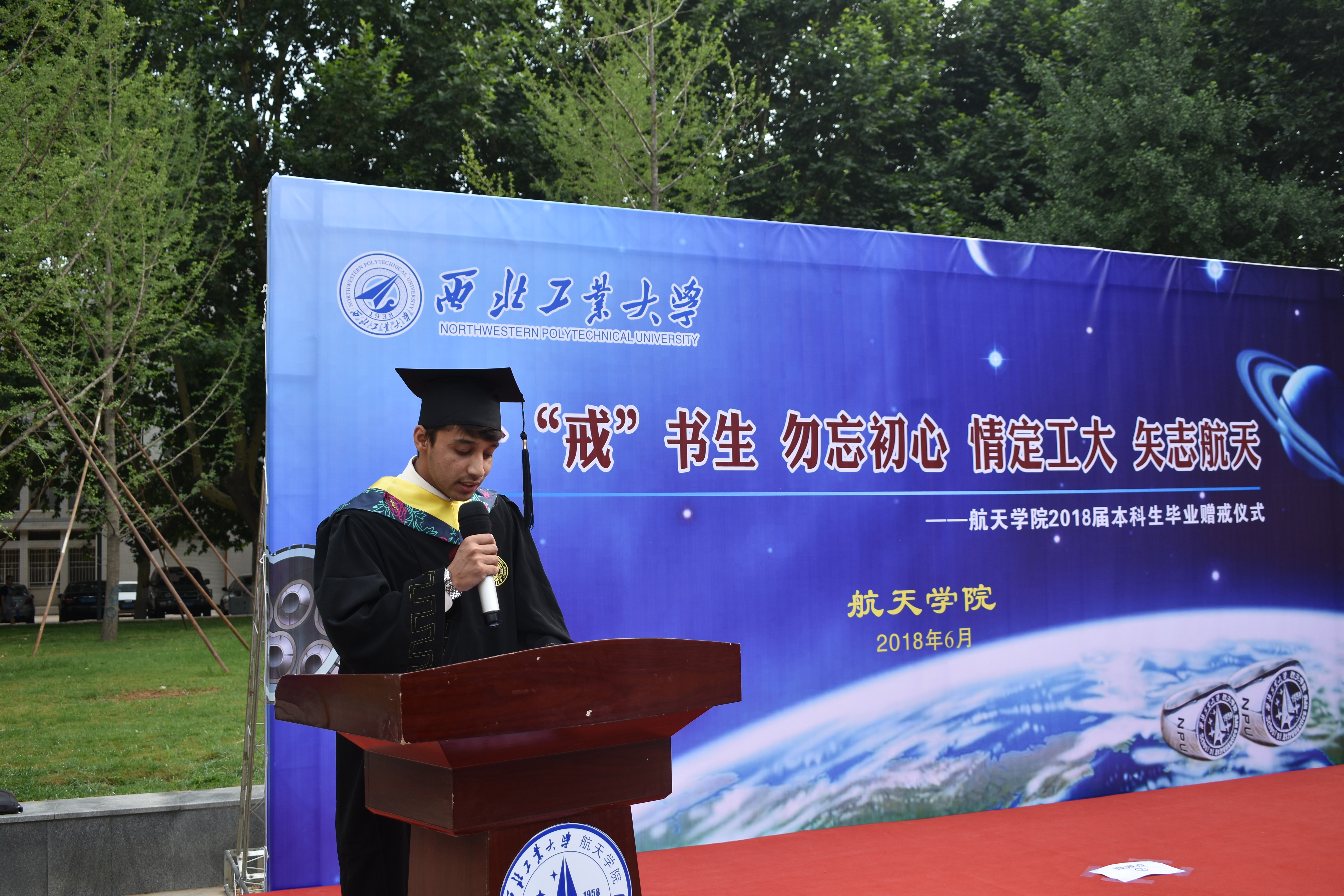 2018年6月15日上午,澳门网投十大信誉平台在友谊校区图书馆广场隆重举行2018届硕士毕业生航天戒授戒仪式。澳门网投十大信誉平台院长唐硕、副院长刘佩进、张科、龚春林、党委副书记岳晓奎、张永福、教学办公室主任张研、学院国际化秘书翟雯,及各小班班主任出席本次授戒仪式。仪式由澳门网投十大信誉平台党委副书记张永福主持。